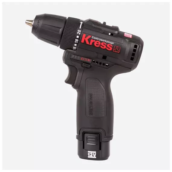 Имеет быстрозажимной 10 мм патроном с блокировкой шпинделя, фиксация оснастки одной рукой. А также 2 рабочие скорости, одна предназначена для работы с крепежом, а вторая для сверления. Наличие муфты регулировки крутящего момента(20+1 позиций ступеней) позволит максимально точно выбрать режим работы. Дрель оснащена светодиодной подсветкой рабочей зоны. Поставляется в комплекте с 2-мя аккумуляторами KRESS 12В 2 А*ч. Аккумуляторы KRESS оснащены электронной платой управления с защитой от глубокого разряда и перегрева, что продлевает срок службы и увеличивает время работы. Данная модель поставляется в кейсе.
