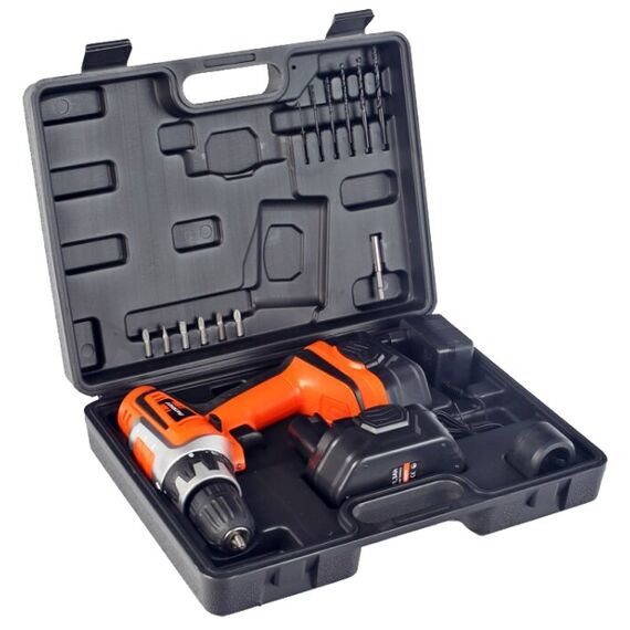 два аккумулятора, зарядное устройство, комплект сверл и бит, кейс