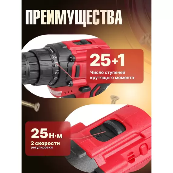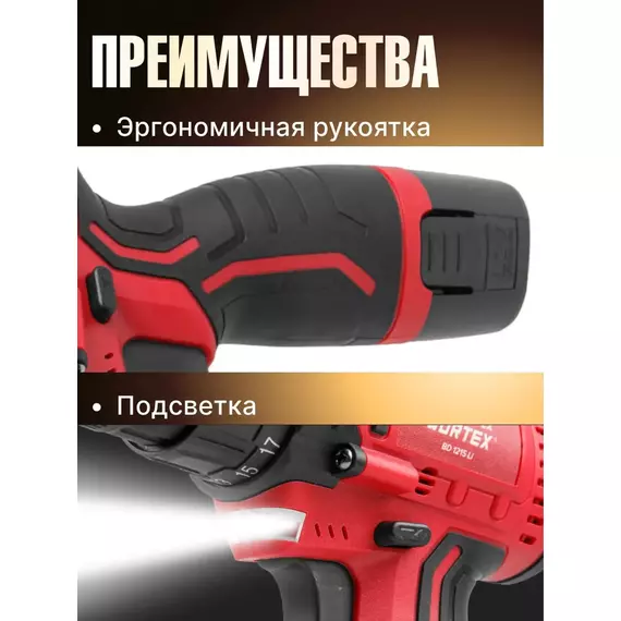Для повышения комфорта использования шуруповерт имеет яркую подсветку, реверс, индикатор уровня заряда аккумулятора, эргономичную обрезиненную рукоятку, удобный пластиковый кейс.