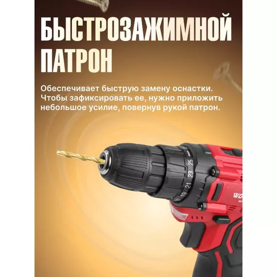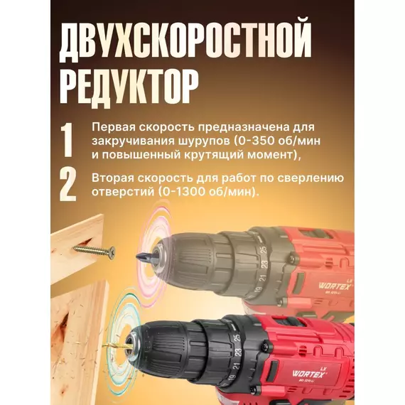 Компактный шуруповерт WORTEX оснащен производительным двигателем и надежным редуктором, что позволяет ему развивать усилие в 25 Н*м.