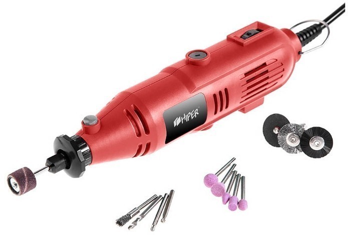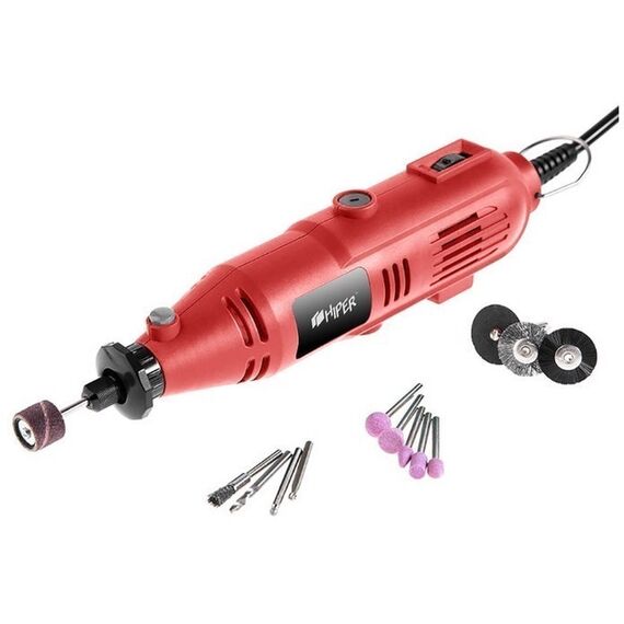 Комплектация: дрель-гравер, оснастка (гибкий вал 1 шт., круги наждачные 2 шт., круги отрезные 13 шт., цилиндры наждачные 5 шт., шарошки абразивные 5 шт., боры 2 шт., круги полировальные 2 шт., сверло 1 шт., цанги 3 шт., полировальные насадки 1 шт., кордщетки 3 шт., держатель наждачных цилиндров 1 шт., держатель полировальных кругов 1 шт., держатель отрезных кругов 1 шт., держатель наждачных кругов 1 шт., точильный камень 1 шт., кронштейн, ключ для замены оснастки), кейс, инструкция