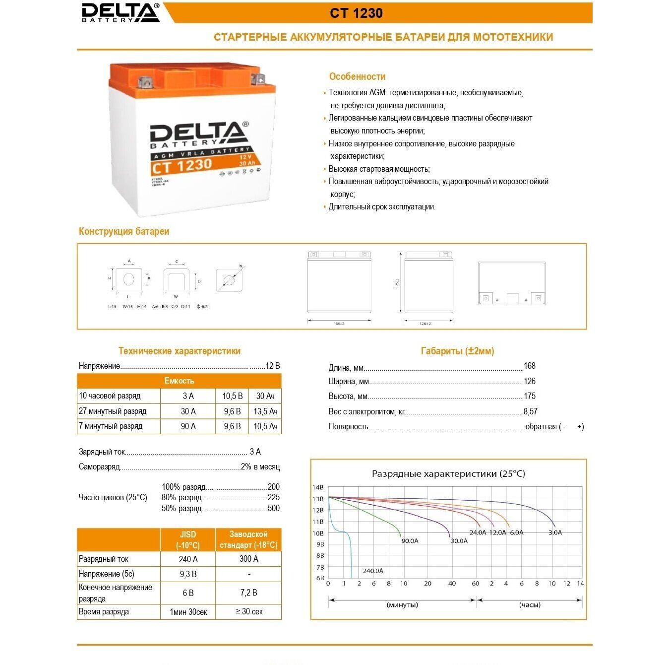Технические характеристики аккумуляторной батареи DELTA CT 1230