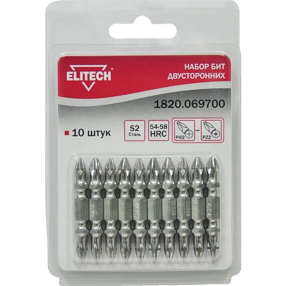 Набор бит ELITECH 1 820.0697 двусторонних, сталь S2,блистер, PH2-PZ2x45мм 10шт