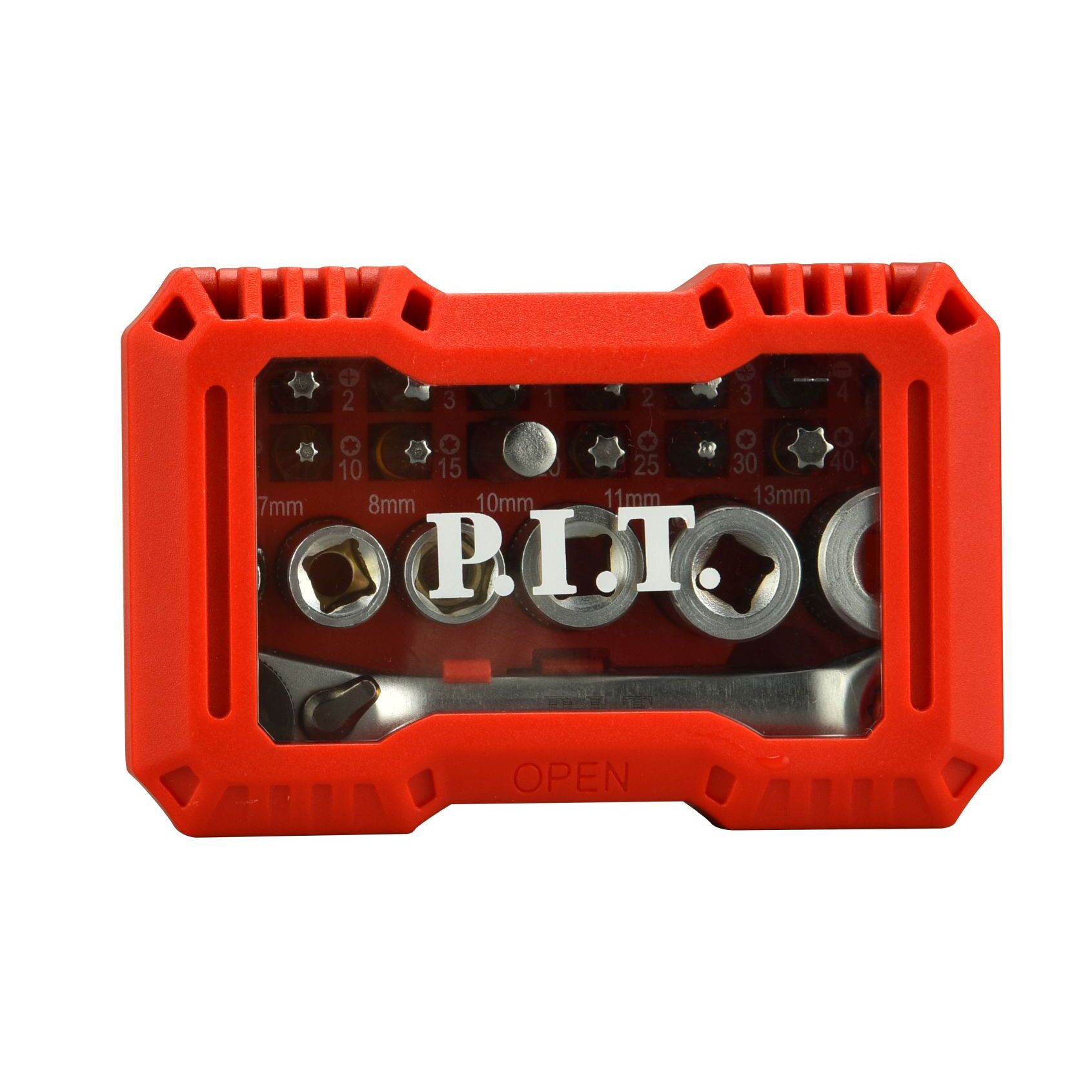 Набор бит P.I.T ASET04-0024 (24 шт)в кейсе, биты закреплены в гнездах, шестигранный хвостовик 1/4 дюйма по стандарту ISO 1173, промышленного качества, с цветными идентифицирующими кольцами для различения типов головок винтов; торцевые головки из хром-ванадиевой стали(CrV) наиболее распространенных размеров, ключ-трещётка из нержавеющей стали с шестигранником 1/4 дюйма по стандарту ISO 1173