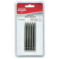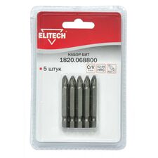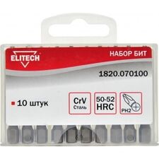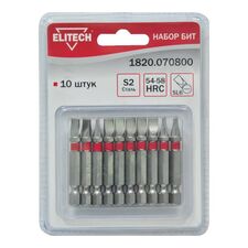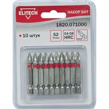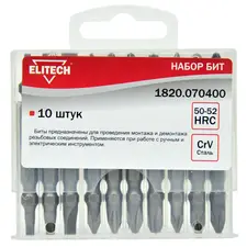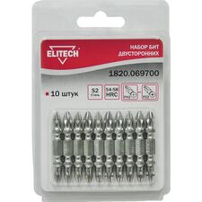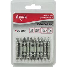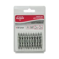 Бренд Elitech Габариты упакованного товара (ДхШхВ) 12 х 8,5 х 1 см Длина, мм 45 Тип бит двухсторонние Количество в упаковке, шт 10 Тип наконечника PH, PZ Хвостовик бит 1/4 (тип Е) Держатель бит нет Адаптер нет Ударные нет Цветная маркировка шлица нет Материал сталь S2...