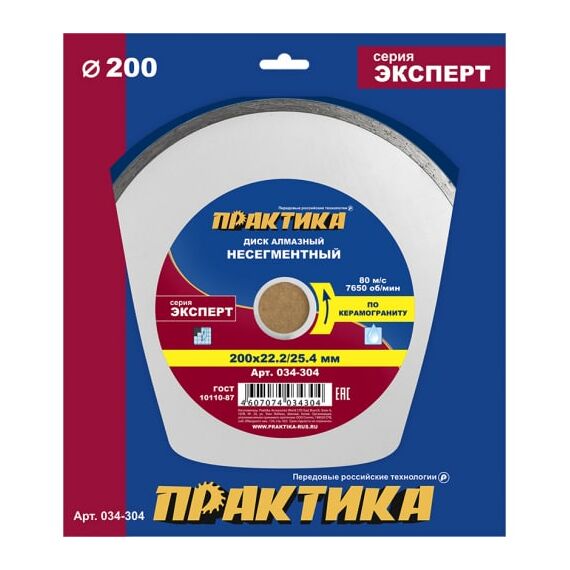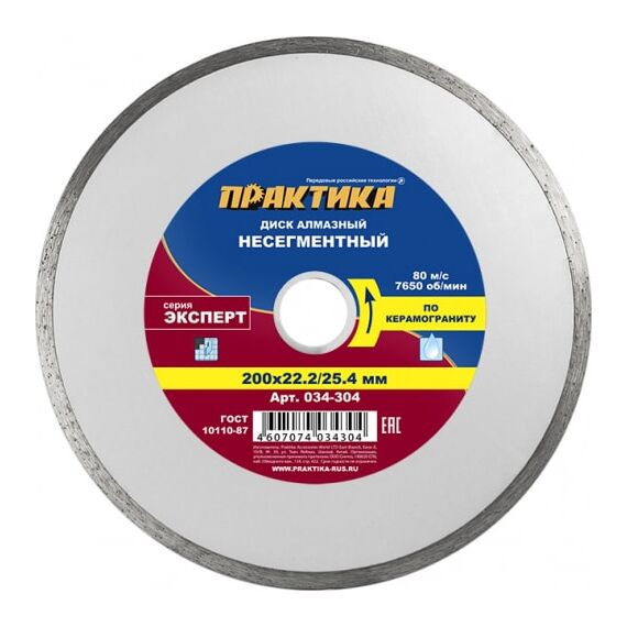 Диск алмазный несегментный Практика Эксперт-керамогранит 200 х 25,4/22 мм (034-304) коробка