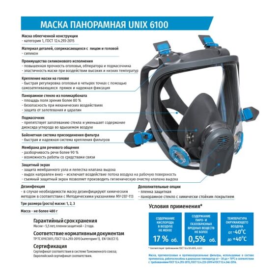 Облегченная панорамная полнолицевая маска UNIX 6100 эффективно защищает лицо и органы дыхания, зрения от воздействия газов, паров и аэрозолей. Используется совместно с фильтрами серии UNIX.