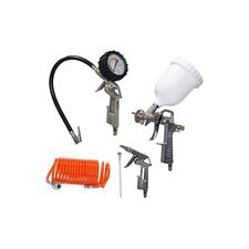 В комплект набора входят: краскораспылитель с нижним бачком объемом 1,0 л, пневмопистолет для вязких жидкостей с бачком 0,85 л, пневмопистолет для продувки, пневмопистолет для накачки шин с манометром, спиральный шланг длиной 5 м.