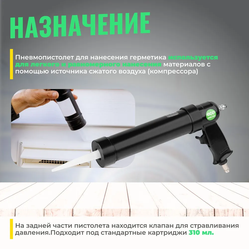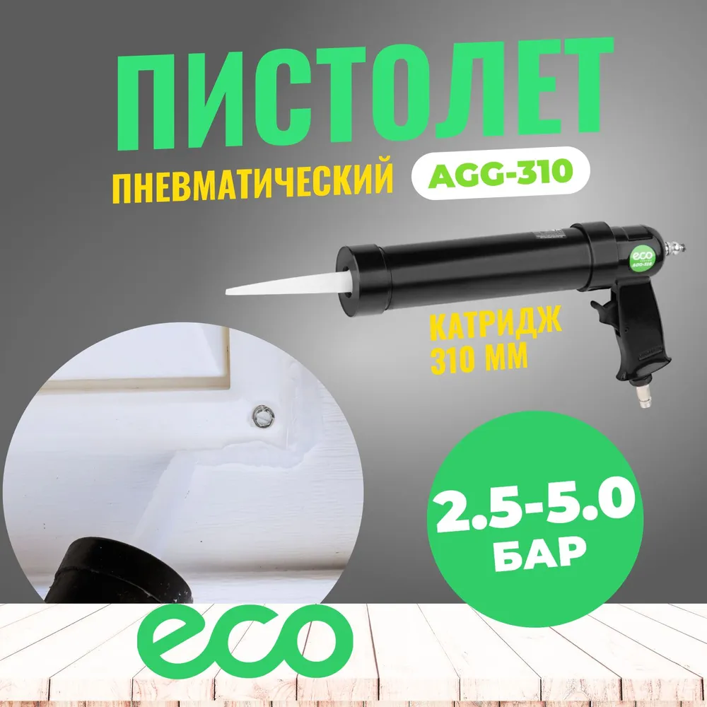 Пневмопистолет для герметика ECO AGG-310 используется для легкого и равномерного нанесения материалов с помощью источника сжатого воздуха (компрессора).