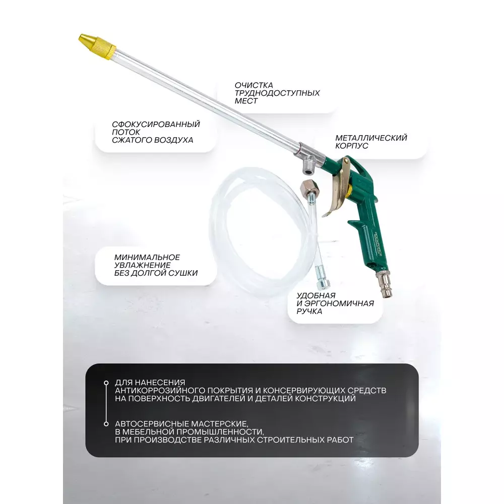 Пневмопистолет для мойки предназначен для нанесения антикоррозийного покрытия и консервирующих средств на поверхность двигателей и деталей конструкций. Устройство данного типа используется в автосервисных мастерских, в мебельной промышленности, при производстве различных строительных работ. Оснащенный длинной насадкой на 230мм, пистолет позволяет проводить уборку даже в труднодоступных местах. Инструмент минимально увлажняет очищаемую поверхность вспененным раствором, не вызывая необходимости долгой хлопотной сушки. Рабочее давление 5 бар. Расход воздуха 130л/мин.