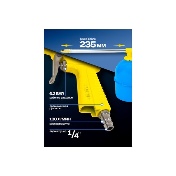 Пневмопистолет для мойки двигателя от бренда Partner - это устройство, которое используется для очистки двигателя автомобиля от грязи, масла и других загрязнений. Он работает на основе сжатого воздуха, который подается в пистолет через специальный бачок.