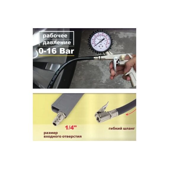Пистолет оборудован манометром для измерения и контроля давления в шине, шлангом и фиксатором на золотнике для фиксации ниппеля шины или камеры, пусковым механизмом и переходником для подключения шланга к компрессору. При помощи пистолета накачать спустившее колесо не составит особого труда.