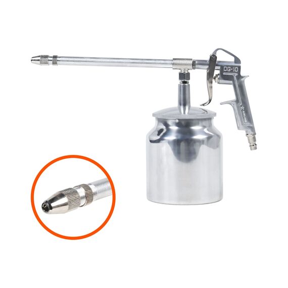 Пистолет изготовлен из металла. Имеет быстросъёмный бачок для распыляемого состава с байонетным присоединением. Прочный металлический корпус устойчив к повреждениям.