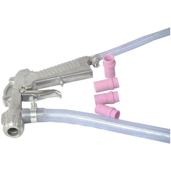 Пистолет пескоструйный для малых камер с форсунками 4 шт. AE&T T063M применяется с целью очистки поверхностей от ржавчины, грязи, краски и прочих загрязнений. Рассчитан на использование с пескоструйными аппаратами T06301, T06302, T06302A. Работает со специальной абразивной смесью или кварцевым песком. Поставляется в комплекте с форсунками.