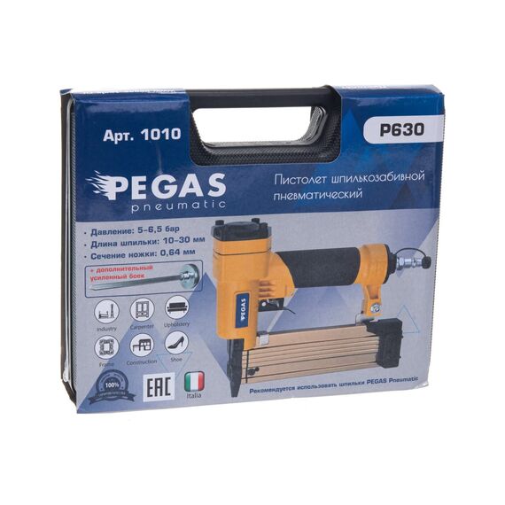 Шпилькозабивной пневматический пистолет Pegas pneumatic P630 PGS-1010 предназначен для изготовления различных конструкций и декоративного оформления. В качестве оснастки используются шпильки длиной 10-30 мм с сечением 0.64 мм.