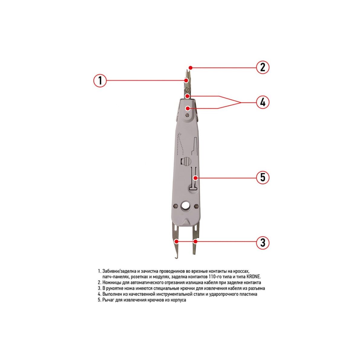 Инструмент REXANT HT-3141 предназначен для заделки и обрезки проводников во врезные контакты на кроссах, патч-панелях, розетках и модулях, заделки контактов 110 типа и типа KRONE.