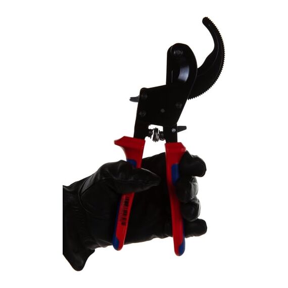 Кабелерез KNIPEX KN-9531250 - профессиональный инструмент для резки медных, алюминиевых, одножильных и многожильных кабелей. Особенности конструкции позволяют достичь оптимальной передачи усилия, а благодаря двухходовому зубчатому приводу процесс резания становится существенно легче. Рукоятки с пластмассовыми чехлами и упорами на конце предотвращают соскальзывания руки пользователя во время работы.