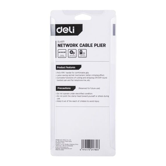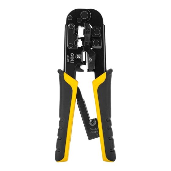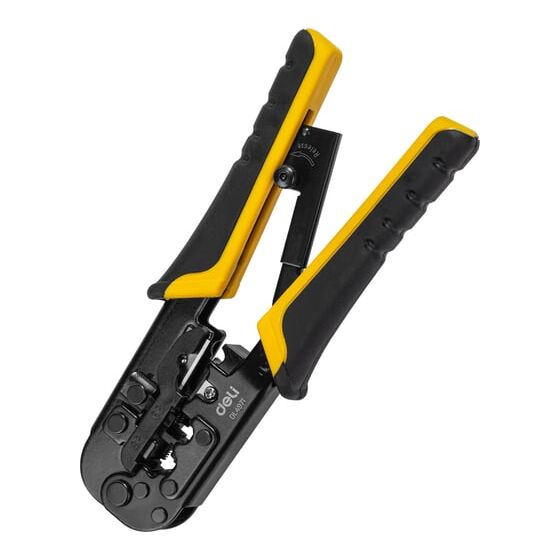 Обжимные клещи DELI DL4971 4P, 6P, 8P 98342 подходят для профессионального использования. Клещи изготовлены из холоднокатаного стального листа углеродистой стали с чёрной отделкой. Материал обладает высокой прочностью и долговечностью. Благодаря двухкомпонентной ручке с храповым механизмом уменьшается усталость при работе с инструментом. Подходит для витой пары UTP / STP и телефонных кабелей, 4P, 6P , 8P.