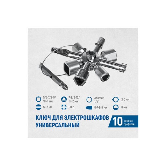Ключ для электрошкафов предназначен для открытия и закрытия устройств блокировки и замков в электросистемах, системах водоснабжения, транспорте на производствах и пр., а также проведения некоторых работ. Ключ состоит из двух частей с магнитным креплением. поставляется в комплекте с двухсторонней PH2 и SL7 битой и соединительной цепочкой. Ключ имеет следующие профили: