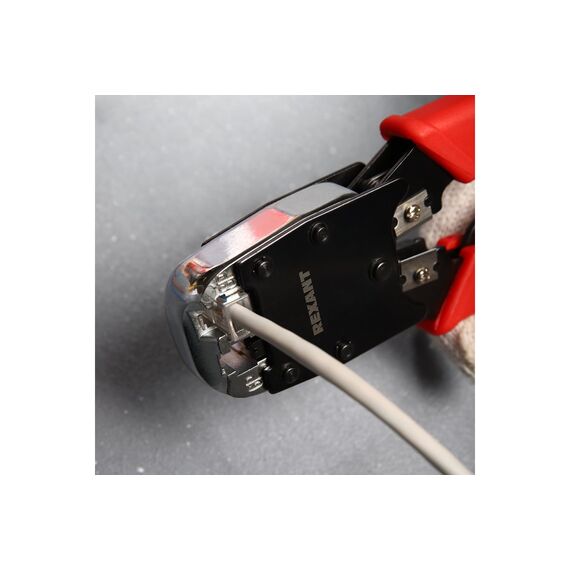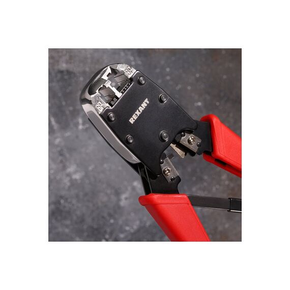 Кримпер REXANT HT-500R — универсальный инструмент для обжима разъемов RJ-45 (8P8C), RJ-12 (6P6C) и RJ-11 (6P4C и 6P2C), снятия изоляции и обрезки проводов.