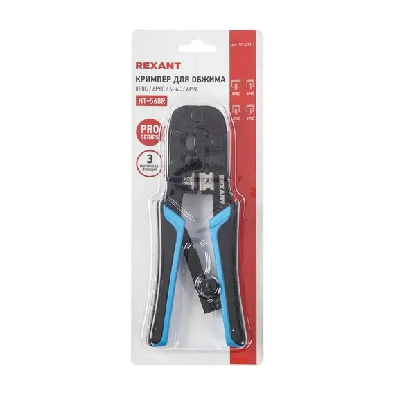 Кримпер REXANT HT-568R ТАЙВАНЬ — универсальный инструмент для обжима разъемов RJ-45 (8P8C), RJ-12 (6P6C) и RJ-11 (6P4C и 6P2C), а также для снятия изоляции и обрезки проводов.