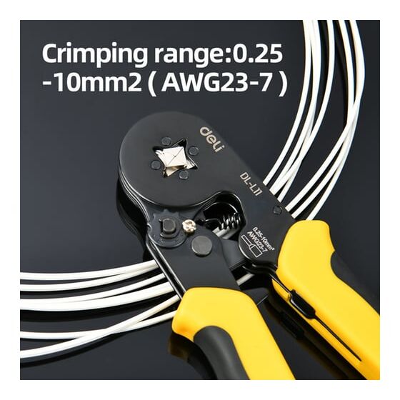 Пресс-клещи Deli DL-L11 предназначены для обжима наконечников НШВИ сечением от 0,25 до 10 кв.мм, что делает их универсальным решением для электромонтажных работ.
