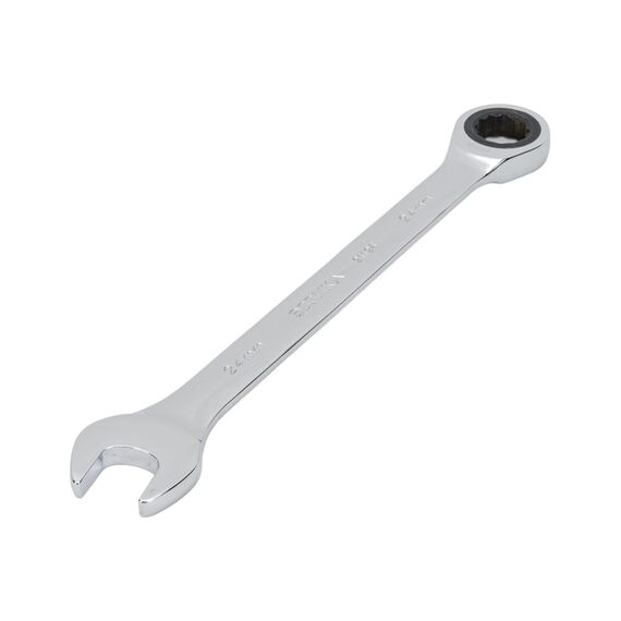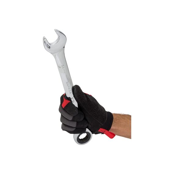 Рожковая и накидная головки обеспечивают доступ к болтам и гайкам сбоку и с торца. Трещотка уменьшает количество действий при вращении ключа и ускоряет работу.