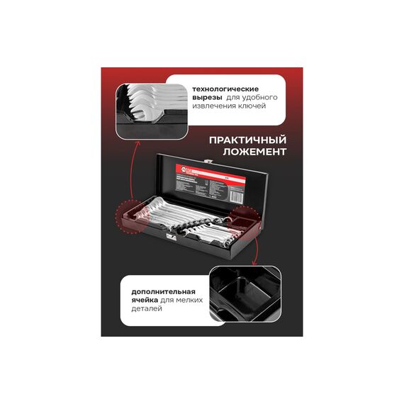 Удобство хранения. Набор поставляется в металлическом кейсе. Все ключи имеют собственную нишу и надежно закреплены. Набор легко брать с собой и всегда удобно хранить в автомобиле. Основным преимуществом данного набора является компактность размеров упаковки и сбалансированный состав набора, в который включены только самые необходимые и востребованные размеры.
