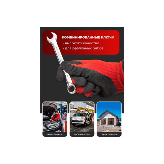 Универсальность. Использование двух одноразмерных профилей делает инструмент универсальным. Его основное достоинство проводить работы в самых труднодоступных местах. Рожковая сторона ключа подходит для работ с крепежом, доступ к которому есть лишь с одной стороны; а накидная часть для проведения работ с высоко нагруженными резьбовыми соединениями. Накидная часть имеет 12 граней. Превосходно подходит для ремонта легковых и грузовых автомобилей мототехники, квадроциклов, снегоходов, гидроциклов , спецтехники, садовой техники и прочих слесарно-монтажных работ с болтовым и гаечным крепежом.