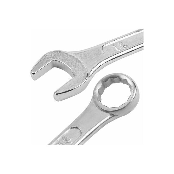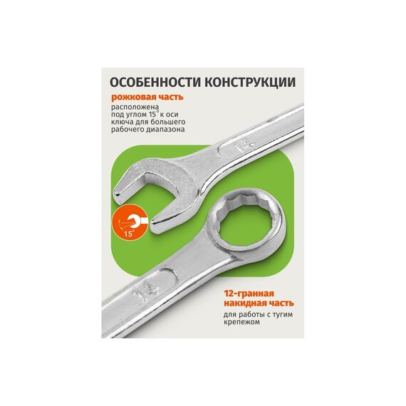 Универсальность. Использование двух одноразмерных профилей делает инструмент универсальным. Его основное достоинство проводить работы в самых труднодоступных местах. Рожковая сторона ключа подходит для работ с крепежом, доступ к которому есть лишь с одной стороны, а накидная часть для проведения работ с высоко нагруженными резьбовыми соединениями. Рожковая часть расположена под углом 15 градусов к оси ключа для большего рабочего диапазона. Накидная часть имеет 12 граней для работы с тугим крепежом.