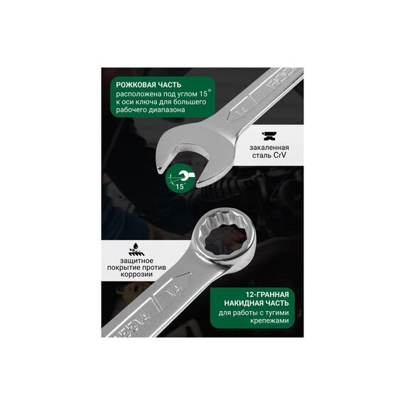 Набор ключей комбинированных, 16 предметов от бренда ROCKFORCE - ручной инструмент для работы с различными резьбовыми соединениями. Накидная часть применяется для работы с тугими крепежными соединениями, а рожковая применятся, если нет возможности накинуть ключ на соединение сверху - в таком случае можно работать с какой-то из сторон рожковым гаечным ключом.
