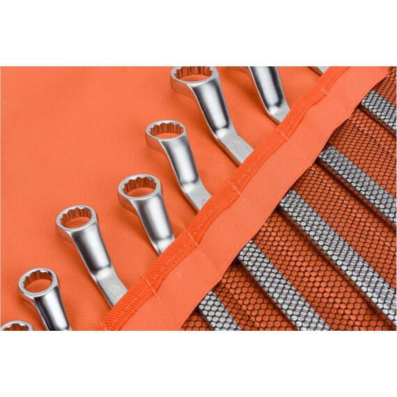 Набор накидных ключей 6-32мм 11 предметов в мягкой сумке Airline AT-11-13 состоит из инструментом с отогнутыми головками. Это существенно упрощает процесс вращения крепежа вблизи поверхности или в слегка утопленных пазах.