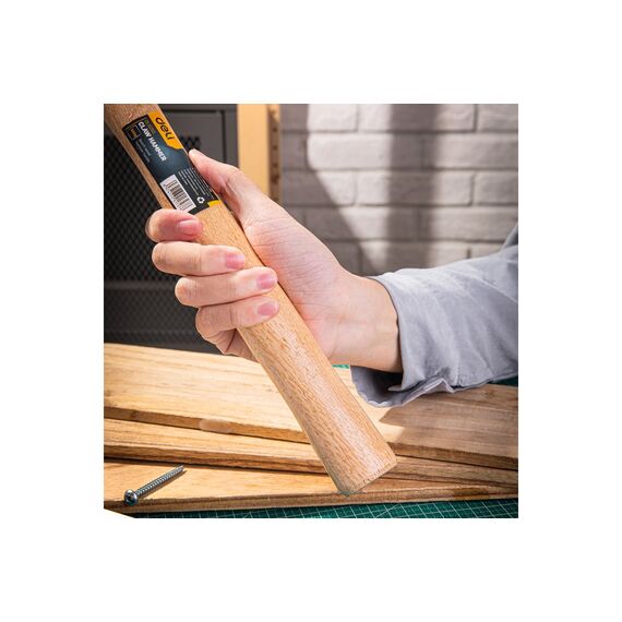 Рукоять молотка выполнена из древесины, что не только обеспечивает надежный захват, но и делает инструмент более прочным и устойчивым к механическим повреждениям.