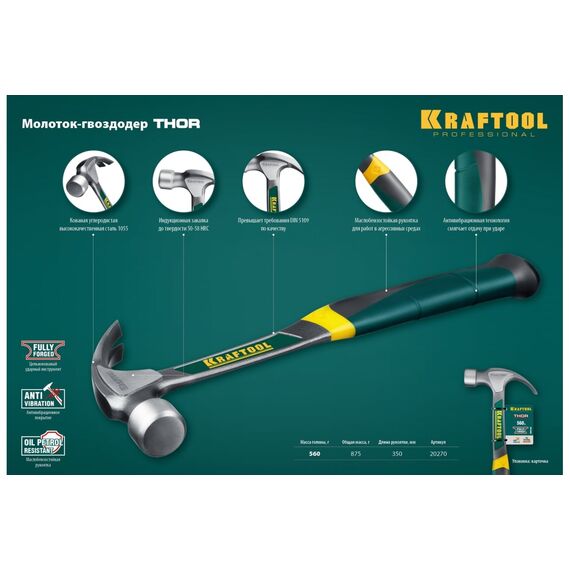 Молоток-гвоздодер 560 г KRAFTOOL 20270 используется для столярных и слесарных работ. Он прекрасно подходит для больших нагрузок. Инструмент сделан из цельной стальной заготовки и имеет эргономичную рукоятку с противоскользящим покрытием, которое препятствует вибрации во время работы.