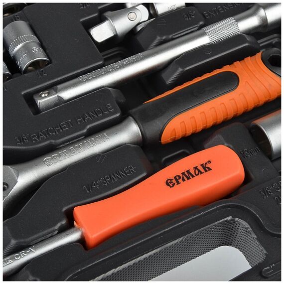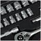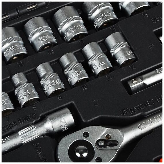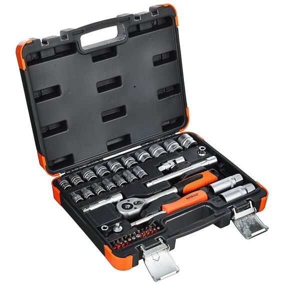 Головки торцевые 3/8: 6-7-8-9-10-11-12-13-14-15-16-17-18-19-20-21-22мм (17 шт) Головка свечная 3/8 16мм Головка свечная 3/8 21мм Карданный шарнир 3/8 Ключ трещоточный с быстрым сбросом 3/8 Удлинитель 75мм 3/8 Удлинитель 150мм 3/8 Переходник 3/8-1/4 Битодержатель 3/8 Битодержатель 1/4 Отвертка с присоединительным квадратом 1/4 Биты 1/4 (22 шт.): -Slotted: 3-4-5.5-7 HEX: 2-3-4-5-6-7 PH: 0-1-2-3 PZ: 1-2-3 TORX: Т10-Т15-Т20-Т25-Т30