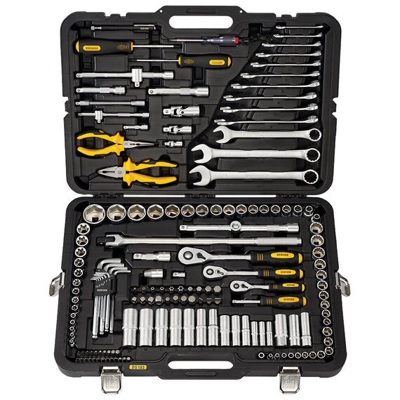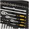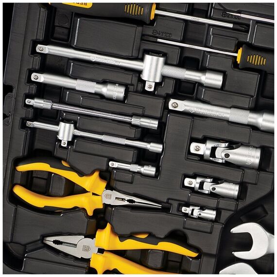 автотестер 6-12-24 V, ручка магнитная телескопическая; трещотка (ключ трещоточный с быстрым сбросом) 45 зубов: 150 мм, 210 мм, 260 мм; адаптер (скользящий переходник); 1/4”М (внешн.) Х 3/8″F (внутр.), (скользящий переходник) 3/8”М (внешн.) Х 1/2″F (внутр.), 3/8”М (внешн.) Х 1/4″F (внутр.), (скользящий переходник) 1/2”М (внешн.) Х 3/8″F (внутр.); отвертка с присоединительным квадратом: 150 мм; удлинитель: 50, 150 мм, 100 мм, 200 мм, 70 мм, 125 мм, 250 мм; удлинитель гибкий: 150 мм; кардан шарнирный 1/4", 3/8", 1/2"; вороток шарнирный: 430 мм