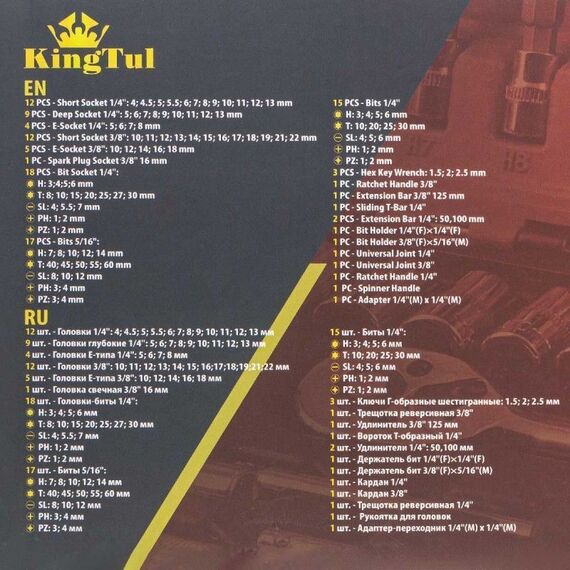 торцевые (24 шт.), глубокие торцевые (9 шт.), торцевые Е-тип (9 шт.), свечные (1 шт.), головки со вставкой (18 шт.)