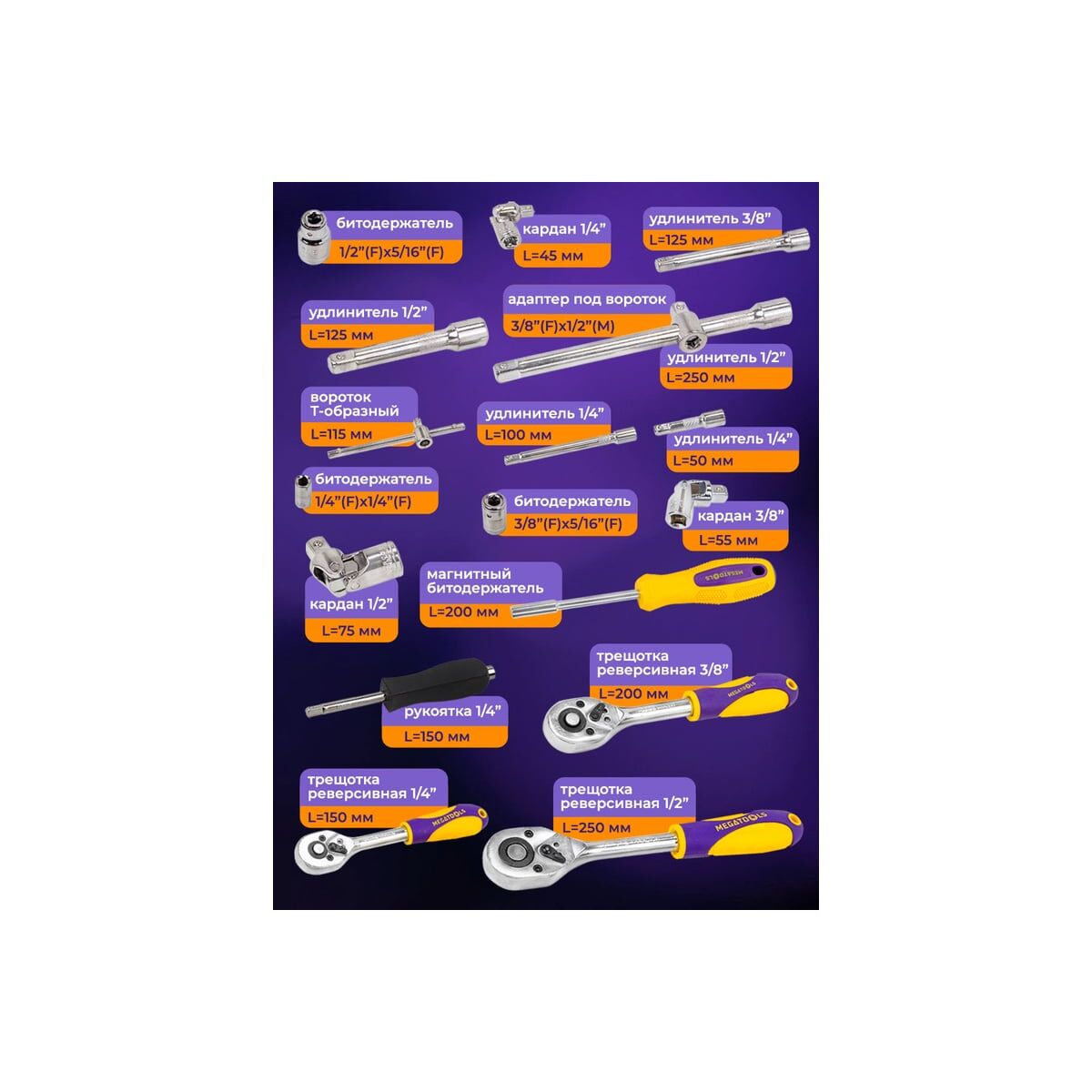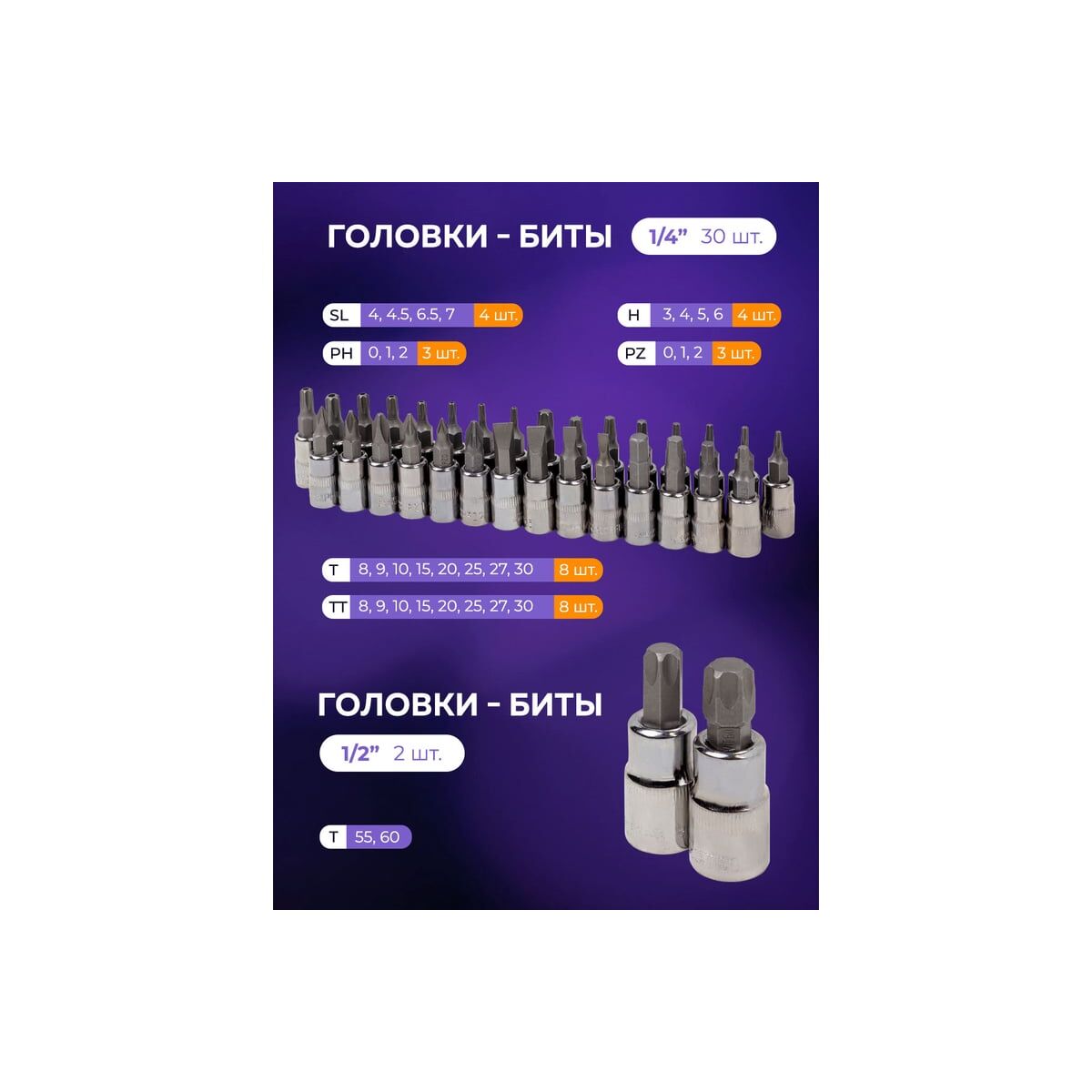 Разнообразие инструментов. В комплекте представлены торцевые головки, головки-биты, свечные головки, трещотки, удлинители и многое другое. С таким разнообразием инструментов вы всегда будете готовы к любым ремонтным задачам, будь то замена свечей зажигания, работа с двигательными механизмами или обслуживание подвески.