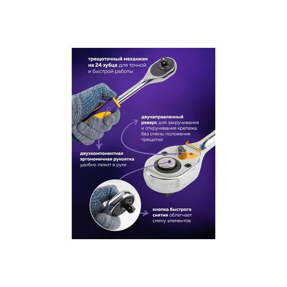 Широкая совместимость. Набор включает инструменты с посадочными квадратами и отверстиями на 3/8", 1/4" и 1/2", что делает его совместимым с большинством стандартных механизмов и оборудования. Вы сможете работать с разными типами крепежей, используя всего один комплект инструментов.