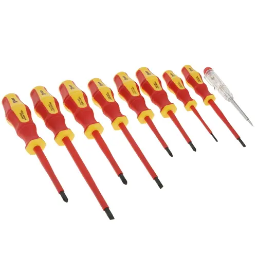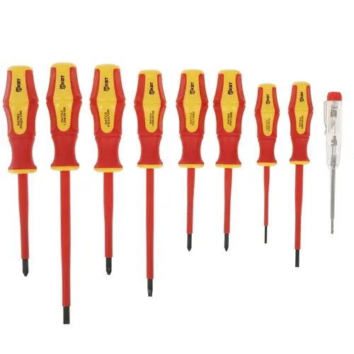 Набор отверток содержит инструменты с крестовым и прямым наконечником. Модель состоит из 9 предметов и подходит для работы под высоким напряжением до 1000 В. Изделие характеризуется повышенной прочностью и обеспечивает безопасность пользователя.