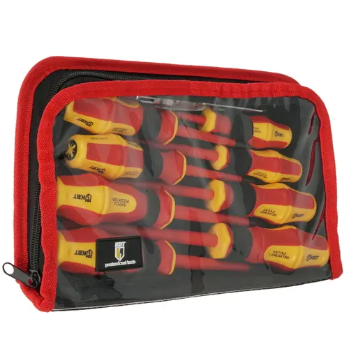 Набор отверток поставляется в сумке с прозрачной поверхность, благодаря чему удобно контролировать содержимое. Изделие надежно застегивается на замок. В комплектации содержатся отвертки разного размера, что удобно для выполнения различных задач. Инструмент обладает диэлектрическими свойствами и имеет магнитный наконечник, что облегчает процесс закручивания. Двухкомпонентная рукоятка имеет специальное антискользящее покрытие.