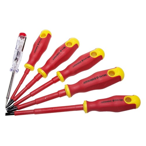 Описание: Набор слесарных отверток STAYER предназначен для выполнения электромонтажных работ под напряжением до 1000В. Стержень из хромованадиевой стали покрыт изоляционным материалом. Оксидированный намагниченный наконечник обеспечивает удобство в работе. Эргономичная изолированная двухкомпонентная рукоятка.