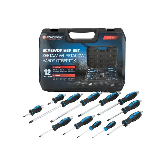 Набор отверток силовых ударных 12 предметов в пластиковом кейсе от бренда Forsage предназначен для работы с крепежными элементами и подходит для выполнения различных монтажных и демонтажных работ.