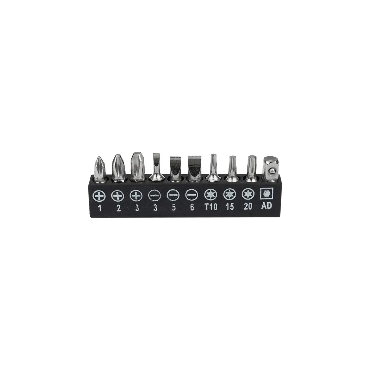 В наборе поставляются: биты SL3.0, SL5.0, SL6.0, PH1, PH2, PH3, T10, T15, T20; головки M5, M6, M7, M8, M9, M10, M11, M12, M13; переходник: AD (□) и жесткий удлинитель.