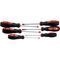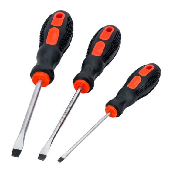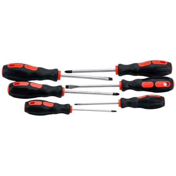 Набор отверток с магнитным наконечником используется при проведении слесарных работ с крепежными соединениями, имеющими крестовой или прямой шлицы. В комплект входят четыре отвертки длиной стержня 100 мм и две отвертки длиной стержня 75 мм.