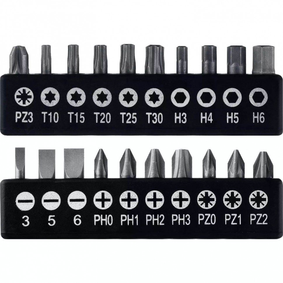 Биты 25 мм, 20 шт.: SL 3, 5, 6 PH 0, 1, 2, 3 PZ 0, 1, 2, 3 TORX 10, 15, 20, 25, 30 HEX 3, 4, 5, 6