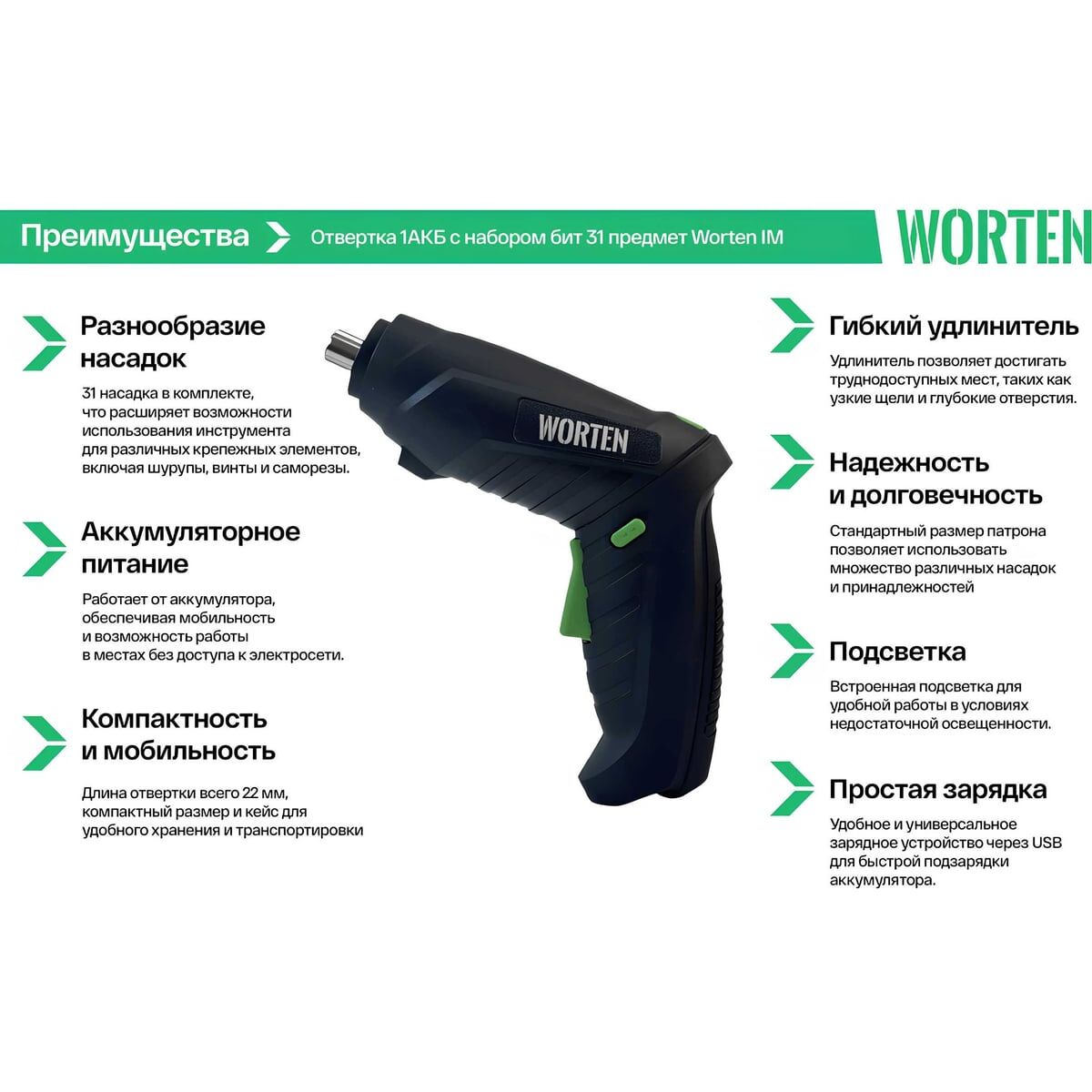 Отвертка аккумуляторная WORTEN IM (КА-90000327) 1АКБ с набором бит 31 предмет