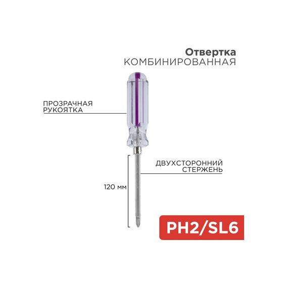 Отвертка комбинированная REXANT 12-4742 двухсторонний стержень 120 мм (крестовая PH 2, шлицевая SL 6 мм)