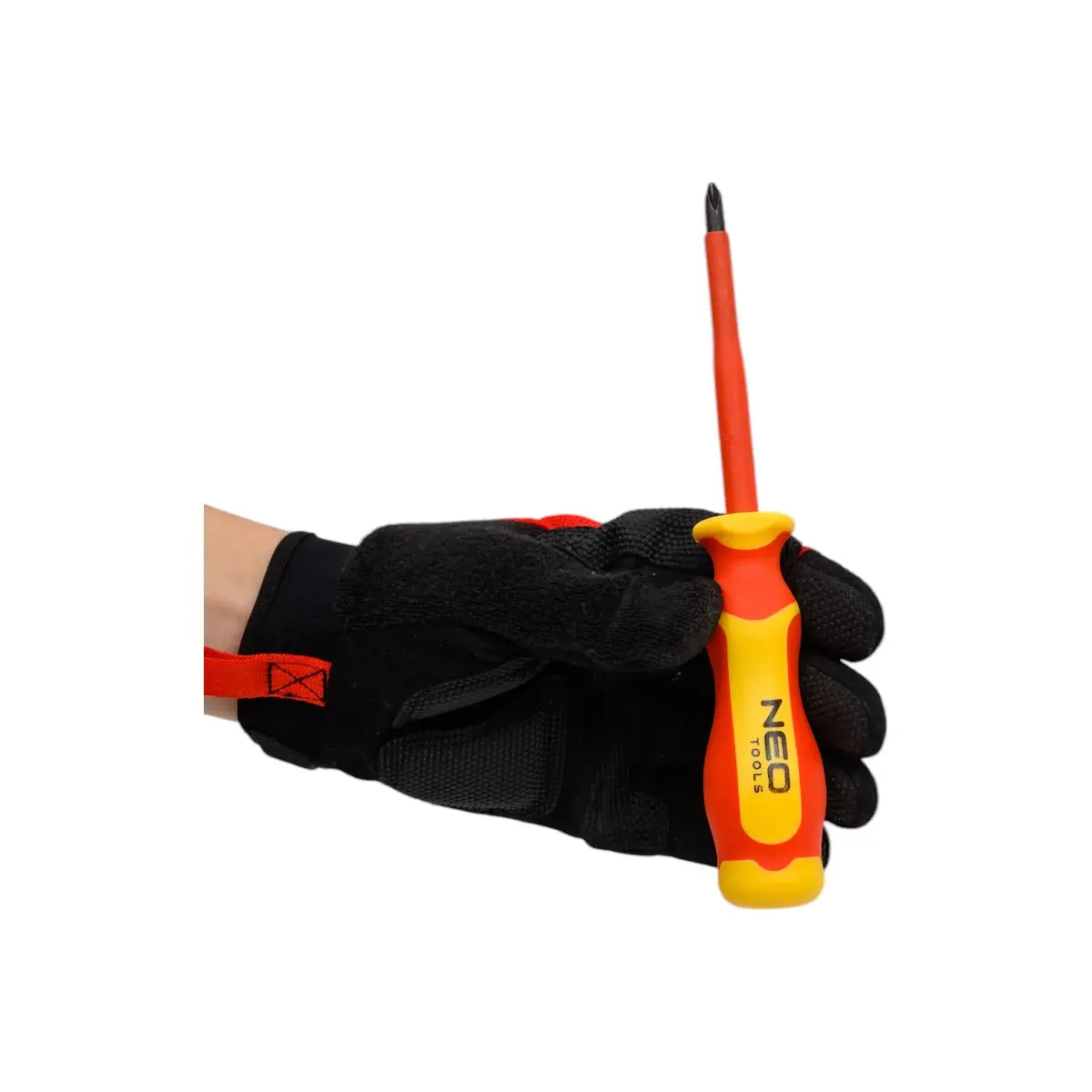 NEO Tools Отвертка PH2 x 6 x 100 mm 1000 В 04-139 сертифицирована для работы под напряжением до 1000 В. Стержень отвертки изготовлен из прочной S2 стали. Отвертка с намагниченным жалом. Специальная эргономичная форма рукоятки уменьшает нагрузку на ладонь во время работы. Двухкомпонентная рукоятка предотвращает скольжение в ладони, стойкая к воздействию химических веществ, масел и смазок. Надежность продукта подтверждает 25-летняя гарантия.