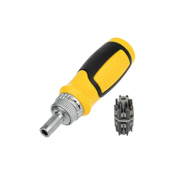 В основании отвертки предусмотрен бокс для хранения насадок. Реверсивный механизм срабатывает как по часовой стрелке, так и против часовой стрелки, а также имеет фиксацию положения.